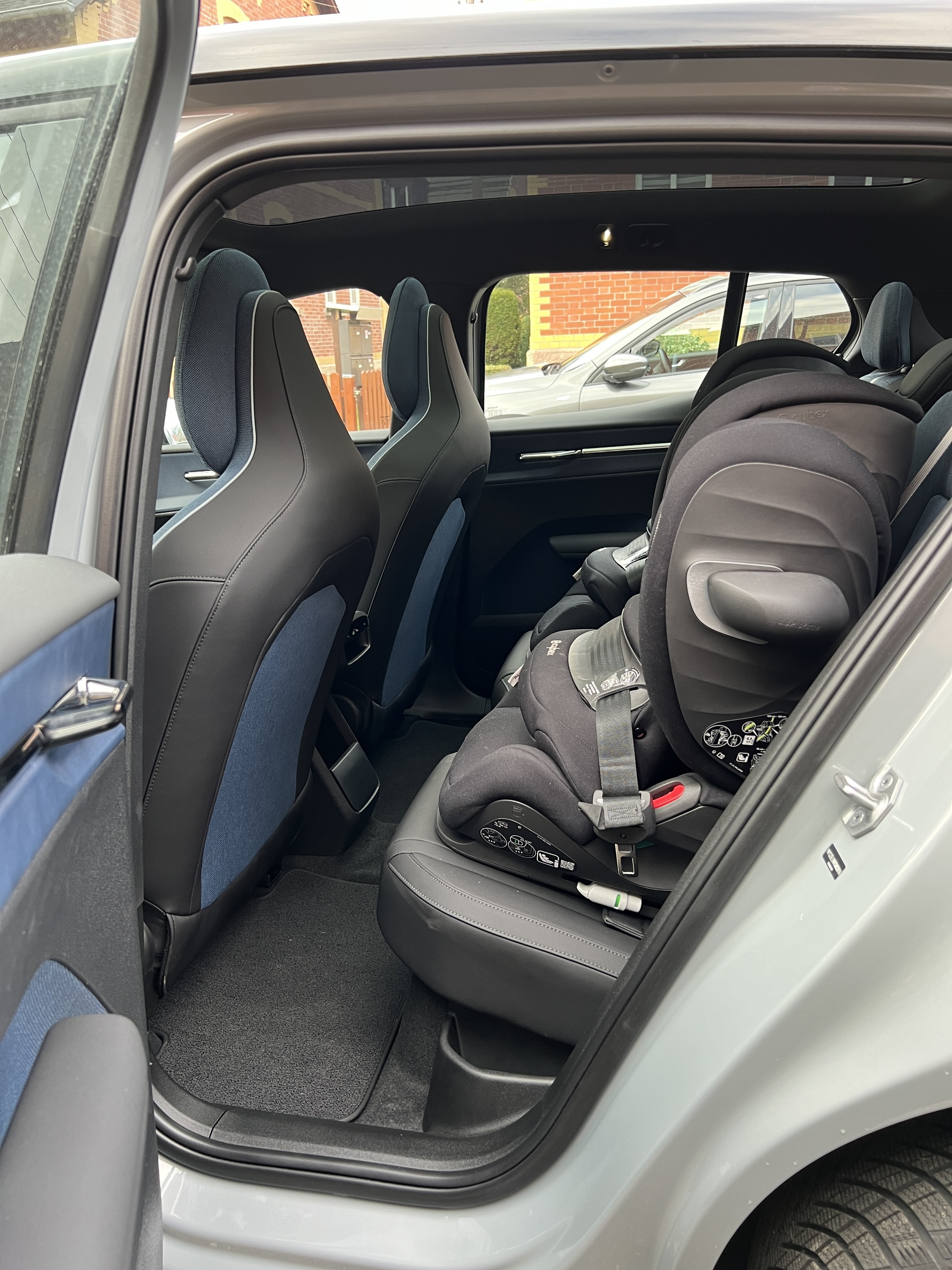 Die Kindersitze Cybex Pallas G iSize waren im EX30 einfach zu installieren. Aufgrund der doch recht schmalen Türöffnung würde ich von einem täglichen/regelmäßigen Ein-/Ausbau abraten.